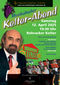 Der Kelterabend ist eine unserer wichtigsten Veranstaltungen des Jahres. In der Rohracker Kelter kommen jedes Jahr Menschen zusammen, um ein „battle“ zwischen unserem Musikverein und einer befreundeten Musikkapelle zu erleben. Genießen Sie diesen musikalischen Schlagabtausch bei leckerem Essen und Weinen von Steilwerk Rohracker.